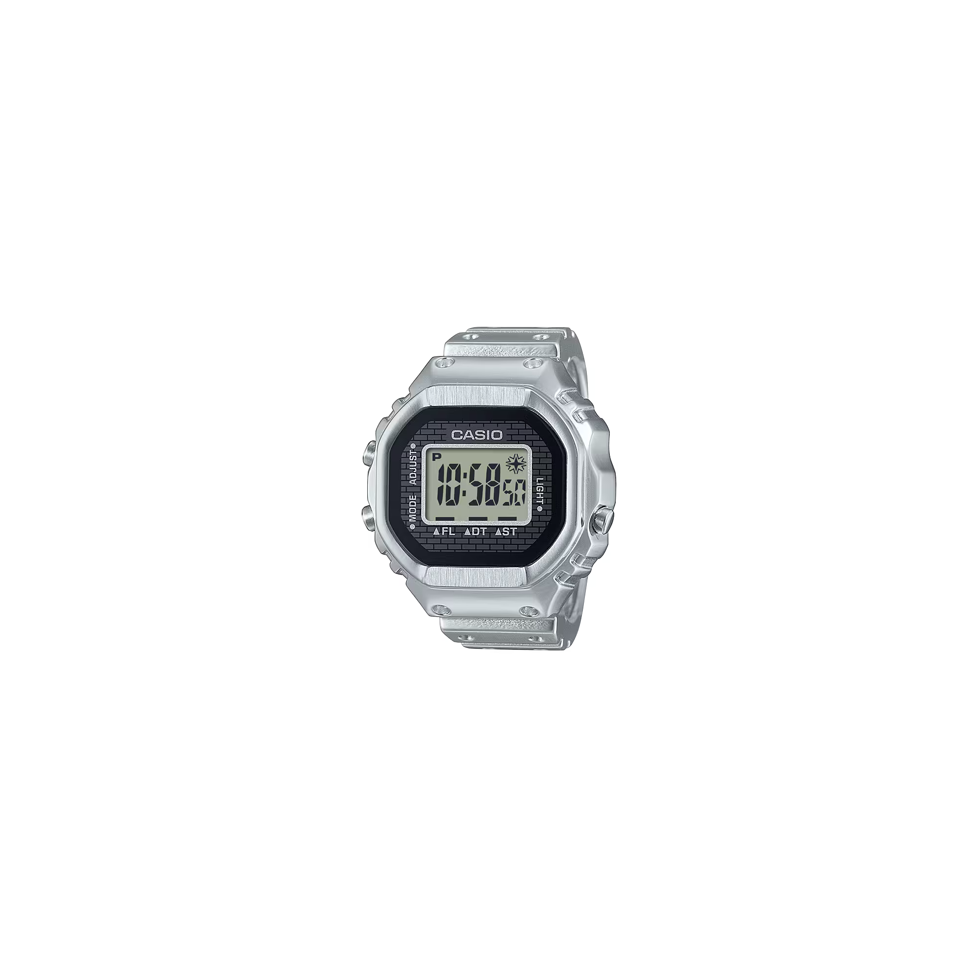 Creating a ring-sized, full-metal version of the Casio watch’s complex form is no easy feat. To make this possible, we needed to use a special method of metal processing to inject a mixture of fine metal powders and resin into a mold. Using metal injection molding (MIM), the case, case back, and ring are molded in one piece, with even the dimpled design on the band faithfully reproduced. A special glass adhesive technique ensures a tight seal for a watch built to be water-resistant while still allowing the battery to be replaced.