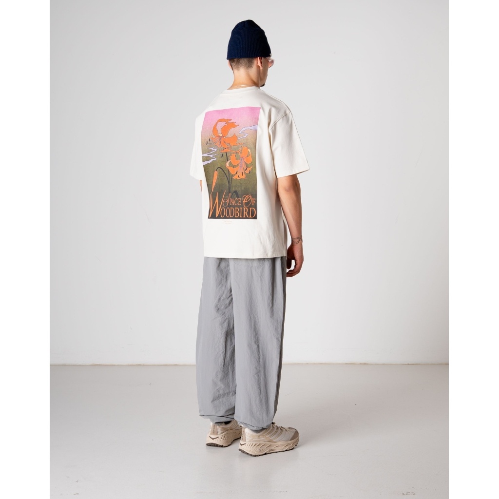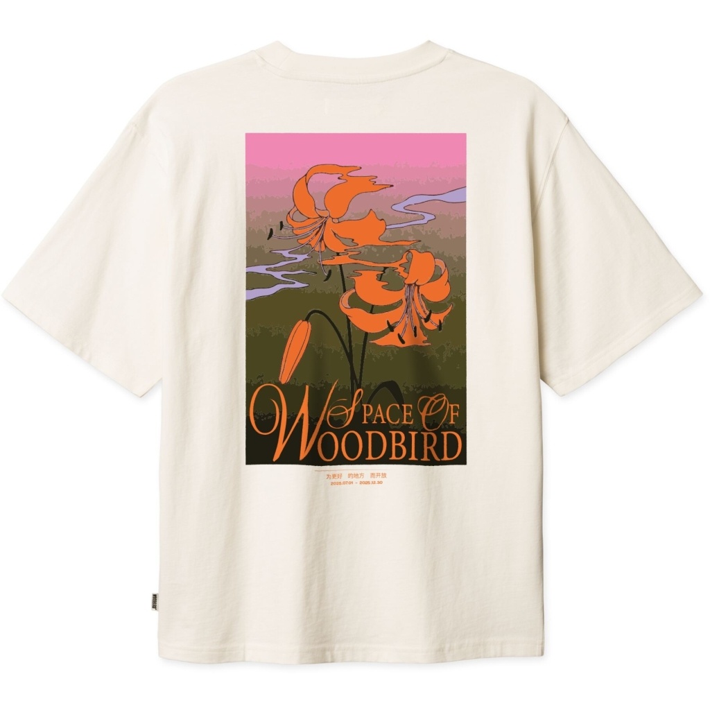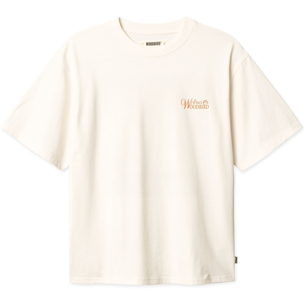 • De WBBAINE Base Tee van WOODBIRD is een beige T-shirt met strakke lijnen en subtiele details. Voorzien van korte mouwen, een comfortabele ronde hals en een subtiel logo op de borst. Op de achterkant geeft de oranje graphic print de tee zijn kenmerkende look: gedurfd maar niet overdreven.