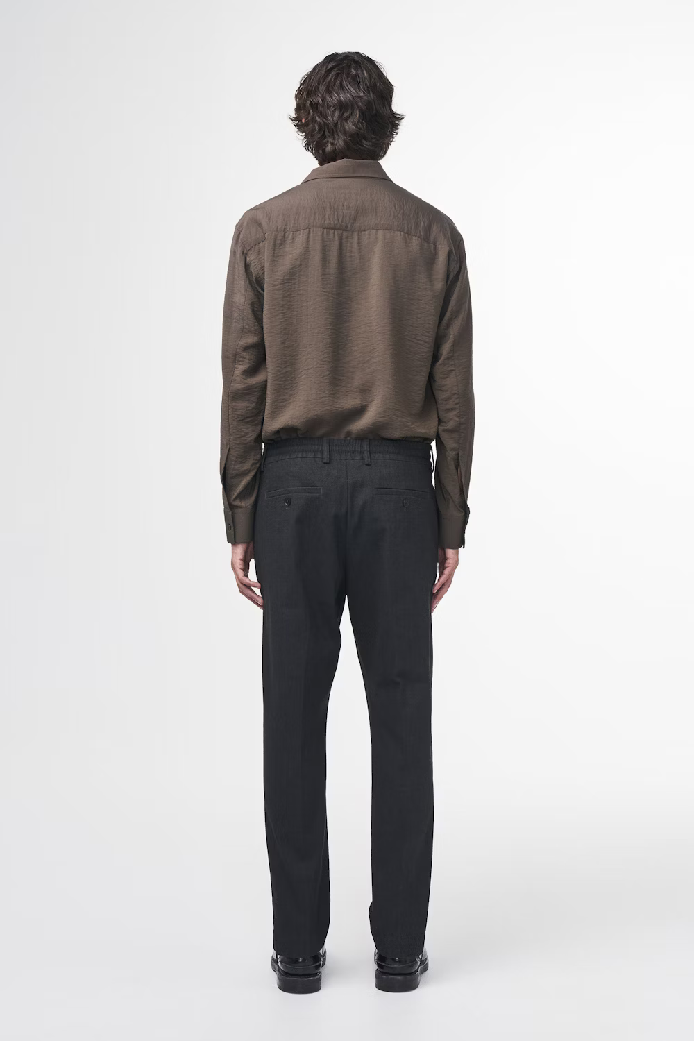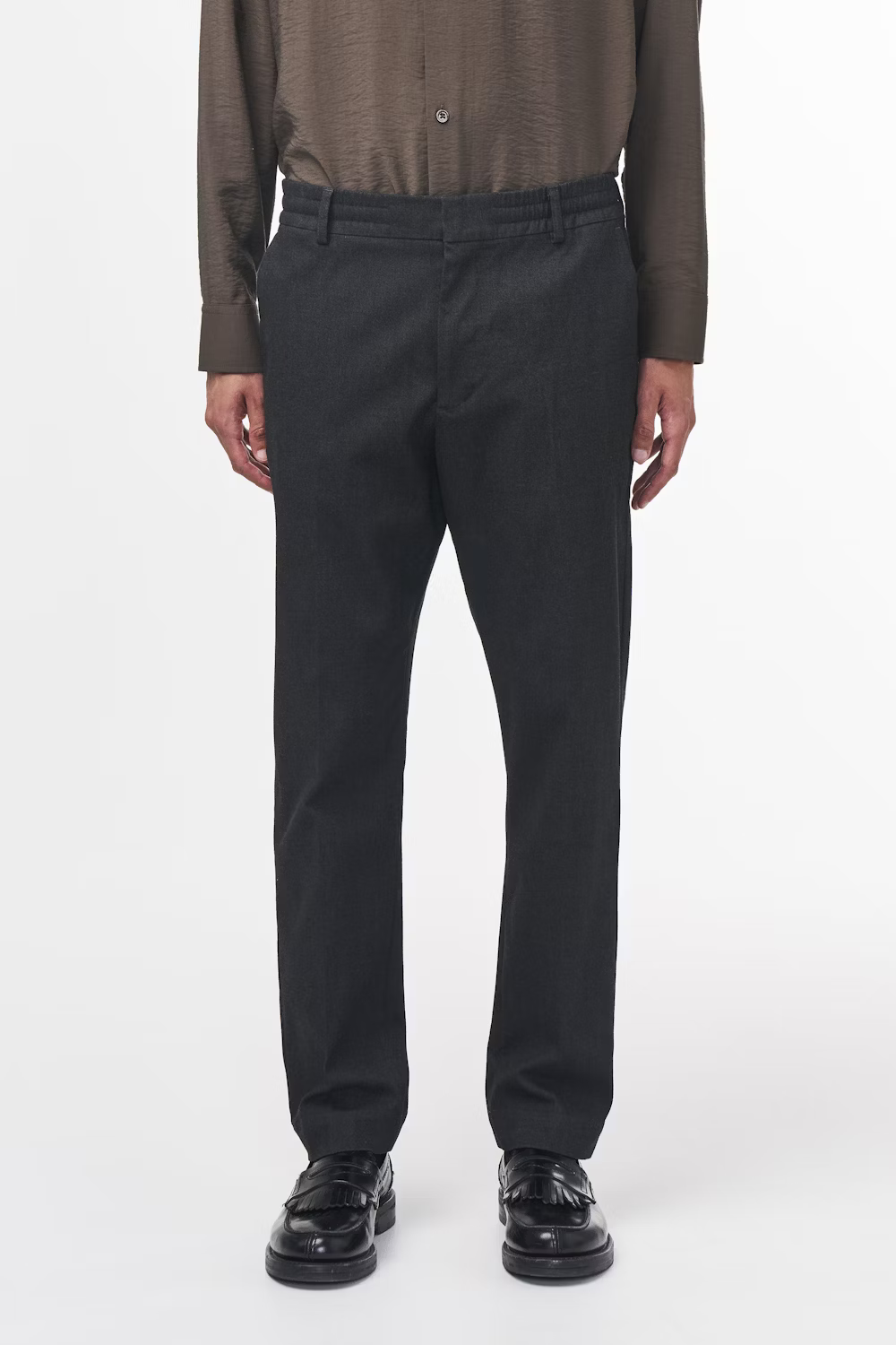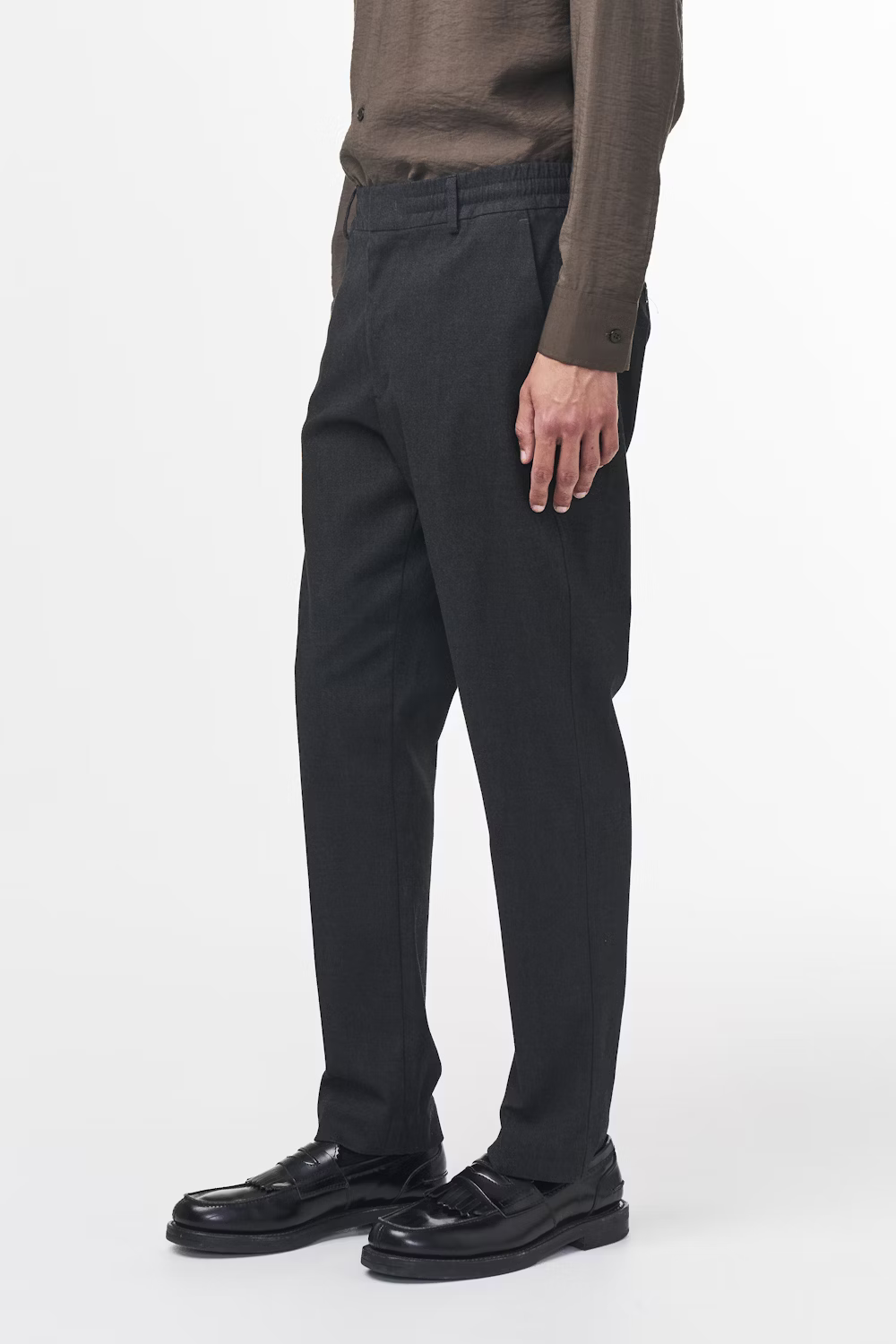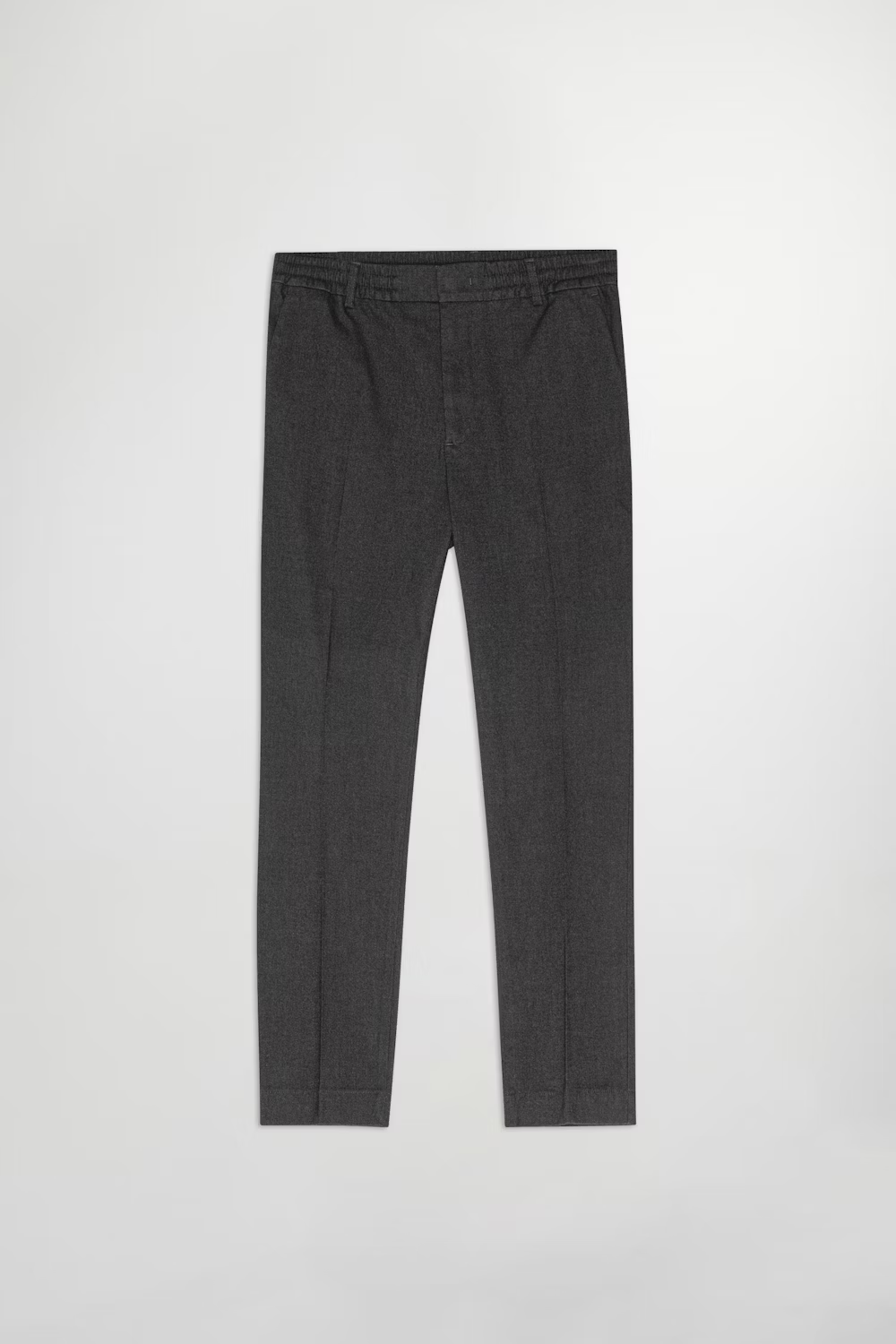 Regular fit pantalon met een taps toelopende pijp, gemaakt van een lichte melange twill blend met stretch voor extra comfort. De broek heeft een trekkoordsluiting, een elastische tailleband en is afgewerkt met een persvouw en gulp met rits.