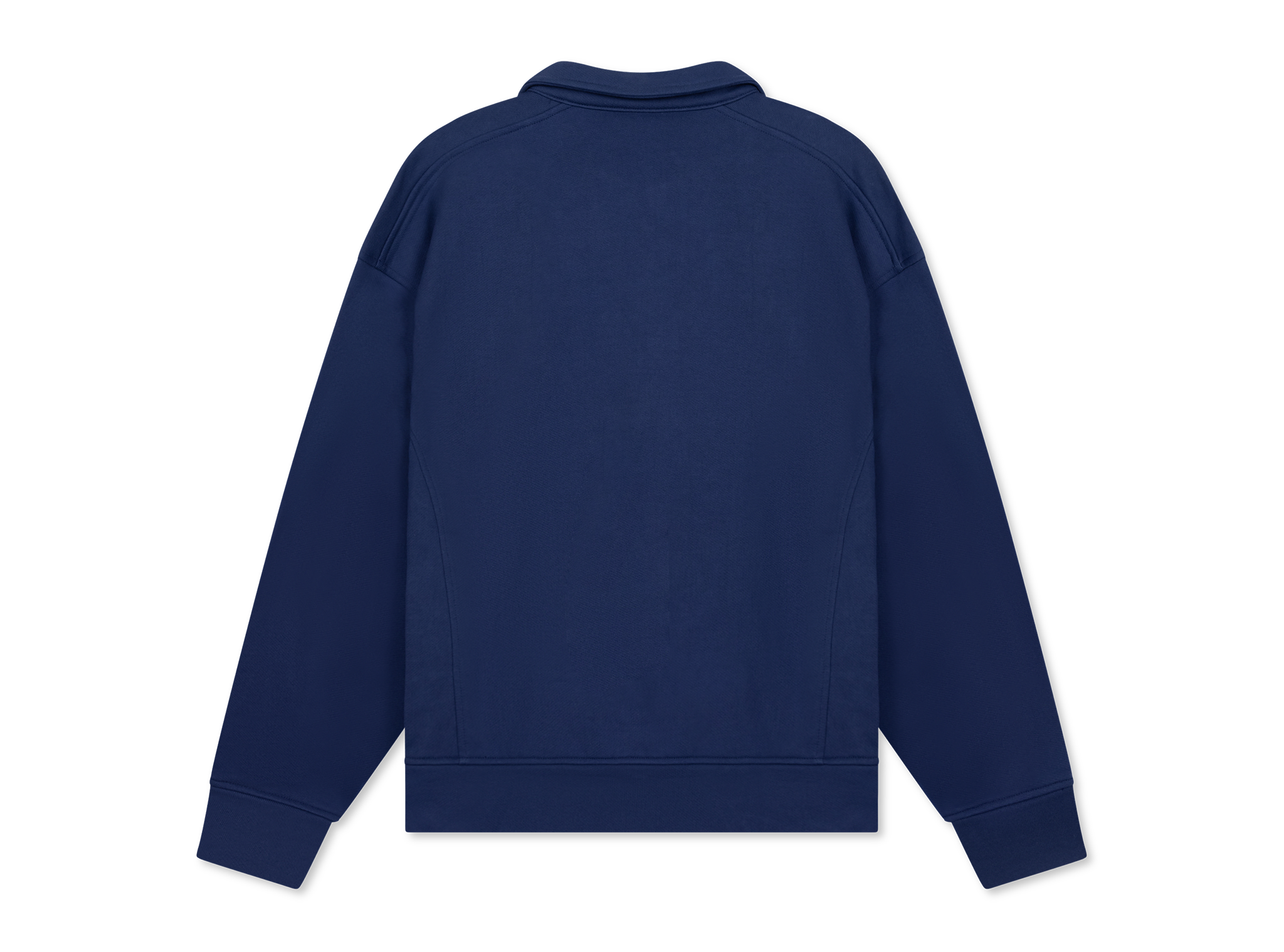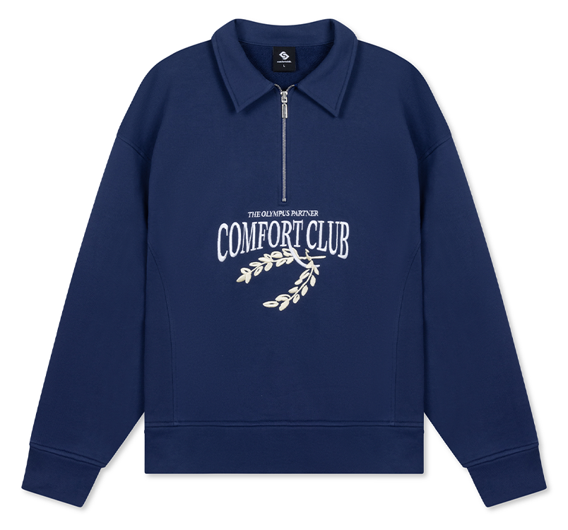 De Medieval Blue Half Zip is een unisex sweater met een iets oversized fit, gemaakt van zwaar katoen. Afgewerkt met een halve ritssluiting, ribboorden en de Comfort Club Laurel-borduursel op de borst.