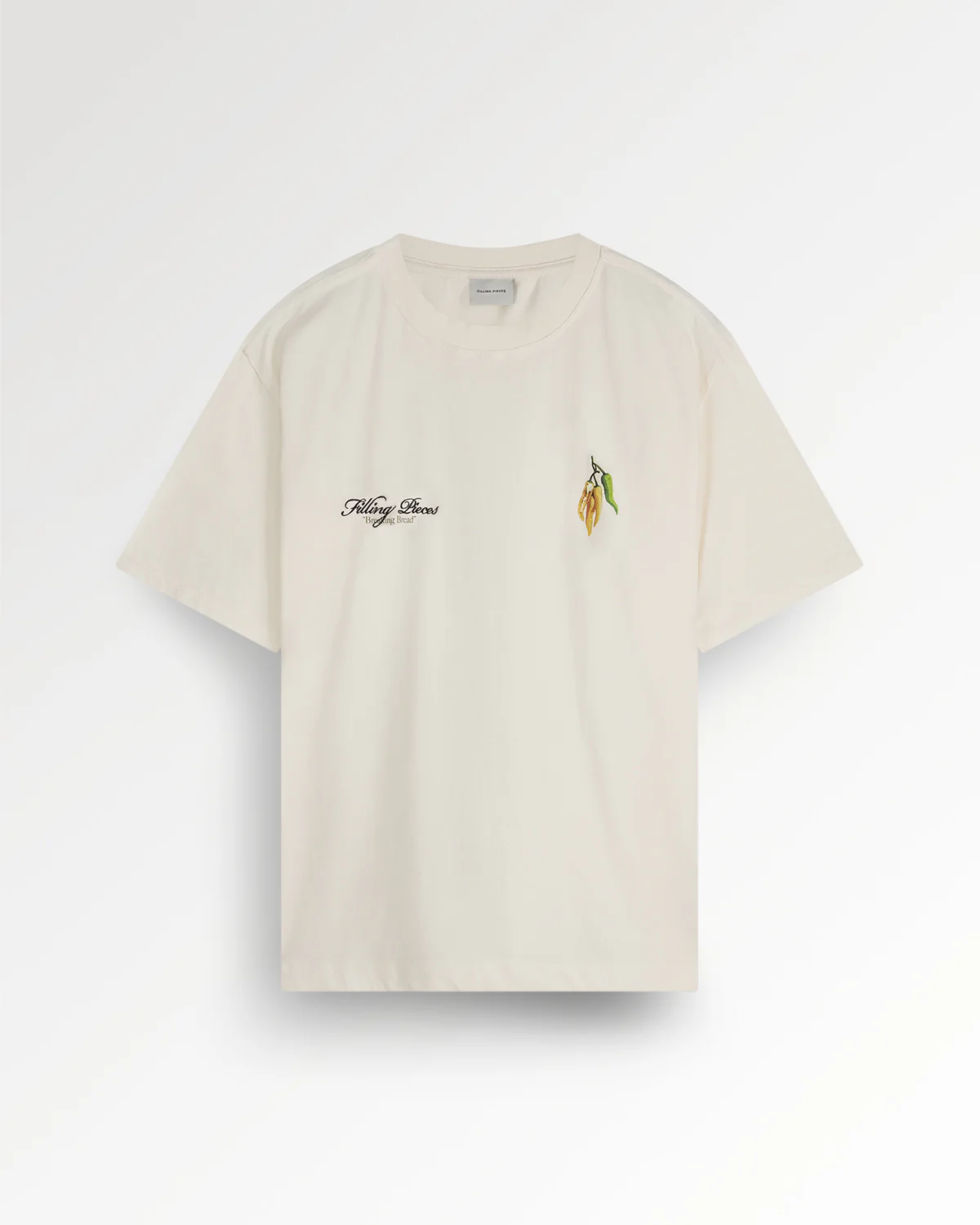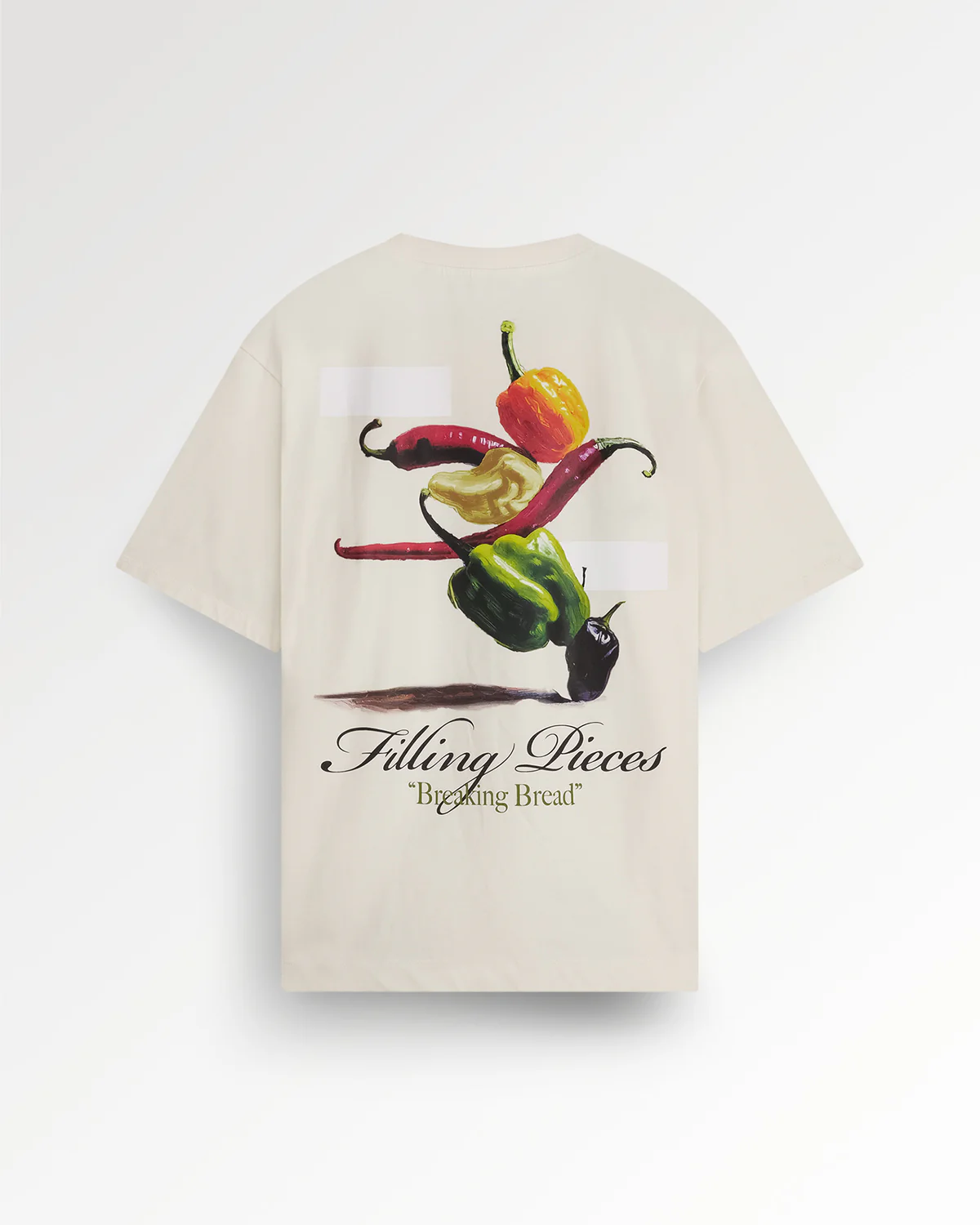 Het T-shirt Pepper fungeert als een draagbaar canvas en is een viering van wereldkeukens. De cleane Antique White basis vormt het perfecte canvas voor het exclusieve, handgeschilderde artwork. De graphic is een “balancing act of the peppers of the world” en toont een compositie van verschillende pepers uit uiteenlopende keukens en culturen. Met een strakke, regular fit is dit T-shirt een uitgesproken statement van culturele waardering en artistiek vakmanschap.