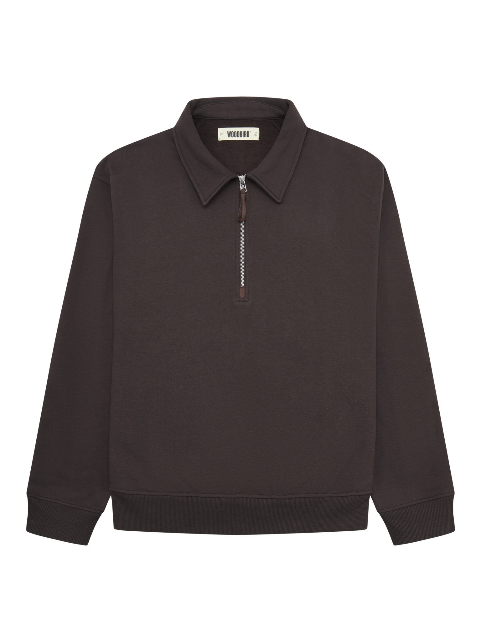 Features long sleeves, pointed collar, half zip closure, and ribbed cuffs and hem.