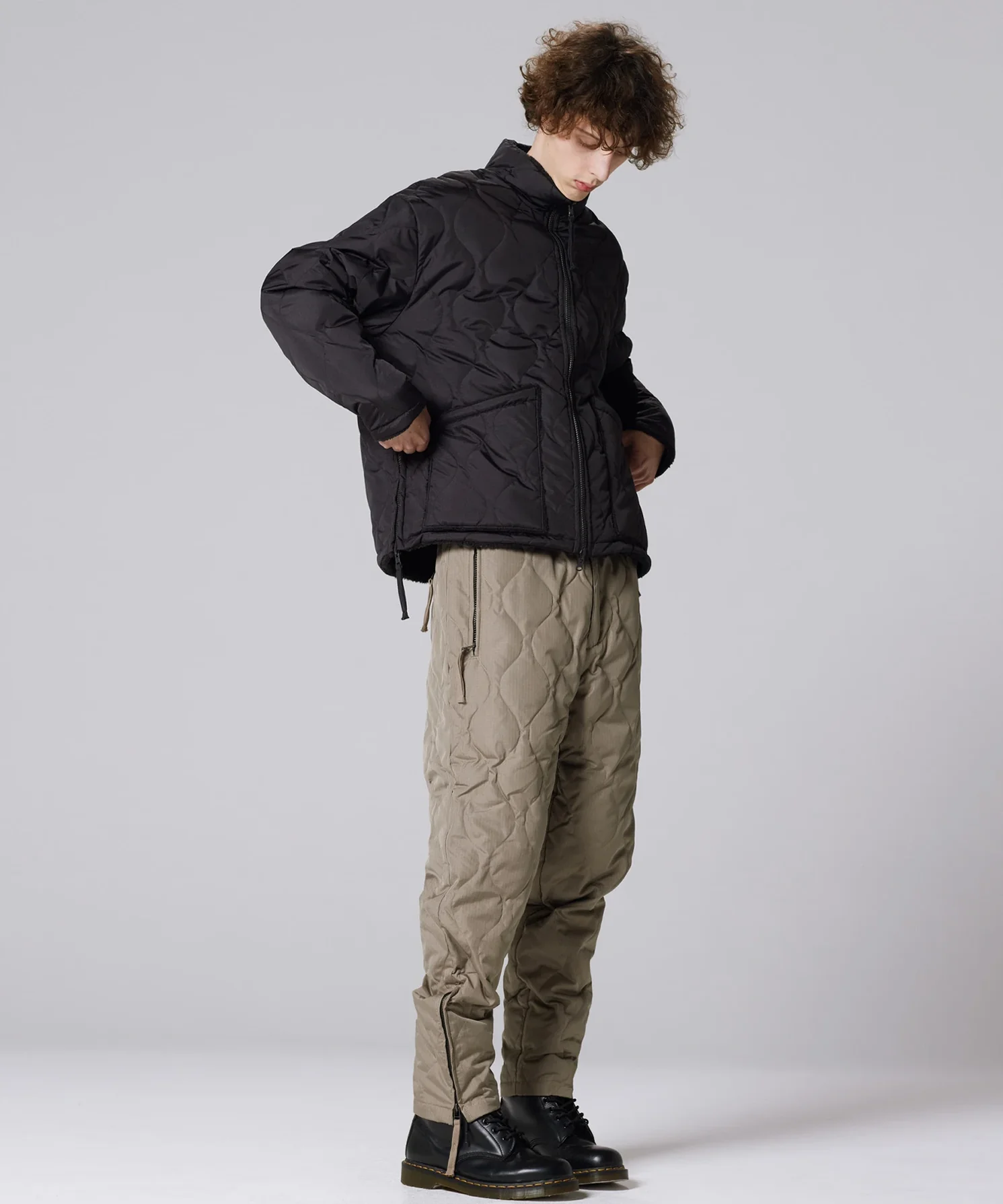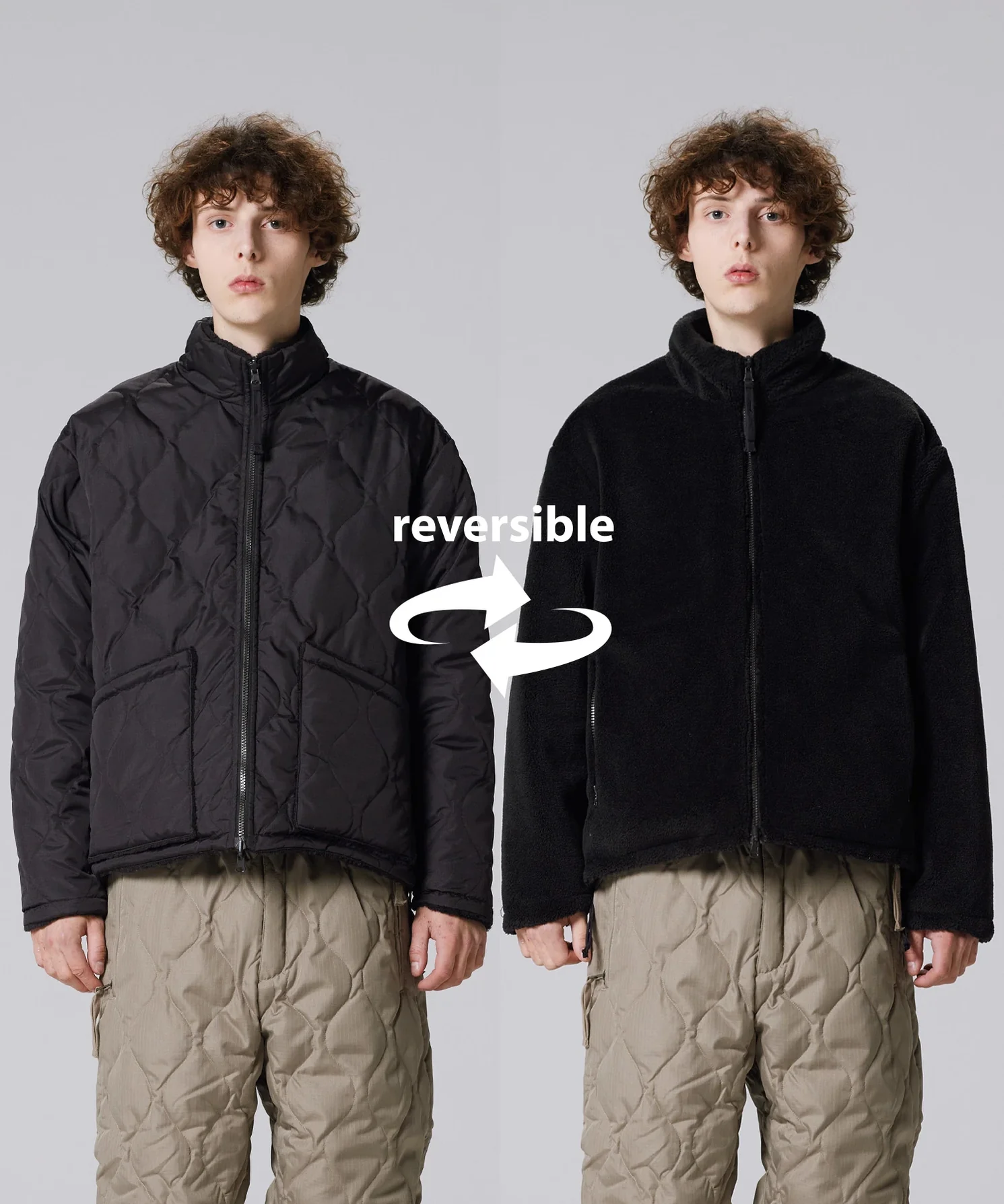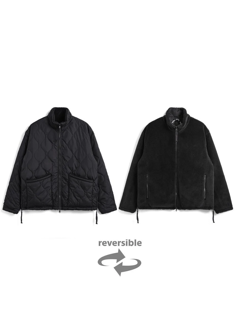This is a reversible military jacket featuring down on one side and boa fleece on the other. The W-layered construction of down and boa offers excellent protection against the cold wind, while the reversible design provides versatility for various occasions. A signature feature of the MILITARY LINE, the side zippered slits enhance mobility, making layering even more enjoyable. The product is designed unisex sizing.
