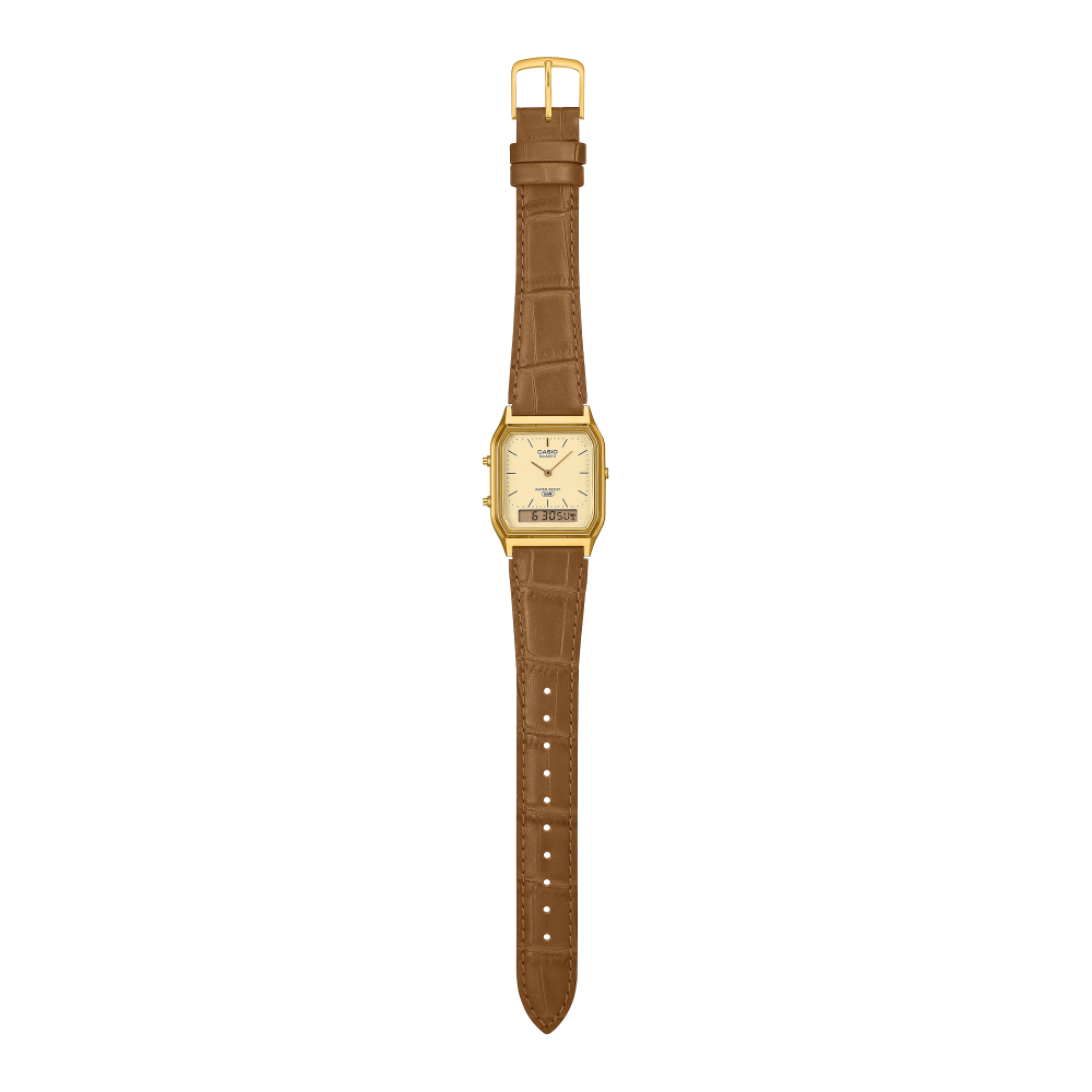 Verwen je liefde voor vintage-geïnspireerde stijl met een analoog-digitaal horloge met een compacte, hoekige wijzerplaat. Het horloge is gebaseerd op de populaire AQ-230 en heeft een elegante, verfijnde uitstraling en is praktisch in gebruik met waterbestendigheid voor dagelijks gebruik, stopwatch, alarm en andere functies. Het klassieke reliëfontwerp van de band voegt een tijdloos tintje toe. Geniet van de verfijning die voortkomt uit doordachte aandacht voor kleine details en de speciale charme die frisse kleuropties bieden.